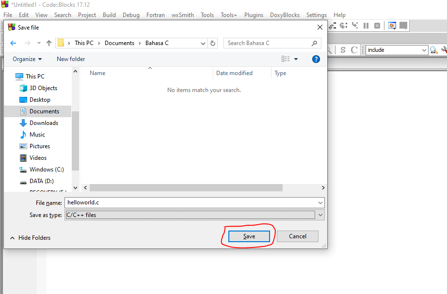 > Tekan saja Ctrl + S ,simpan dimana anda inginkan dan berikan nama file dengan diakhiri .c lalu klik Save.
