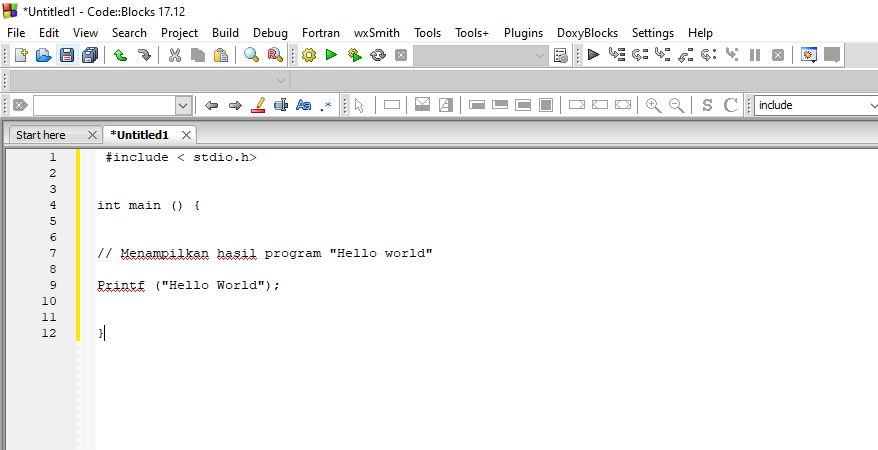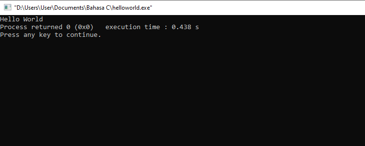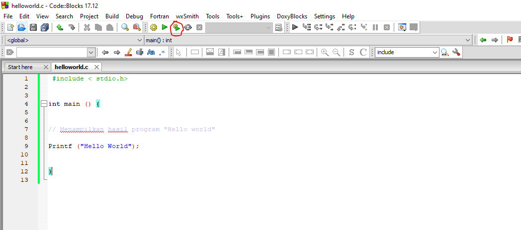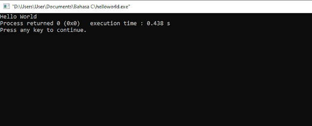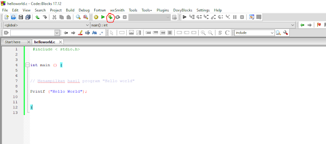 > Saat telah disimpan maka file akan berubah mejadi (nama file.c) .Lalu running program dengan menekan build and run yang terletak diatas .