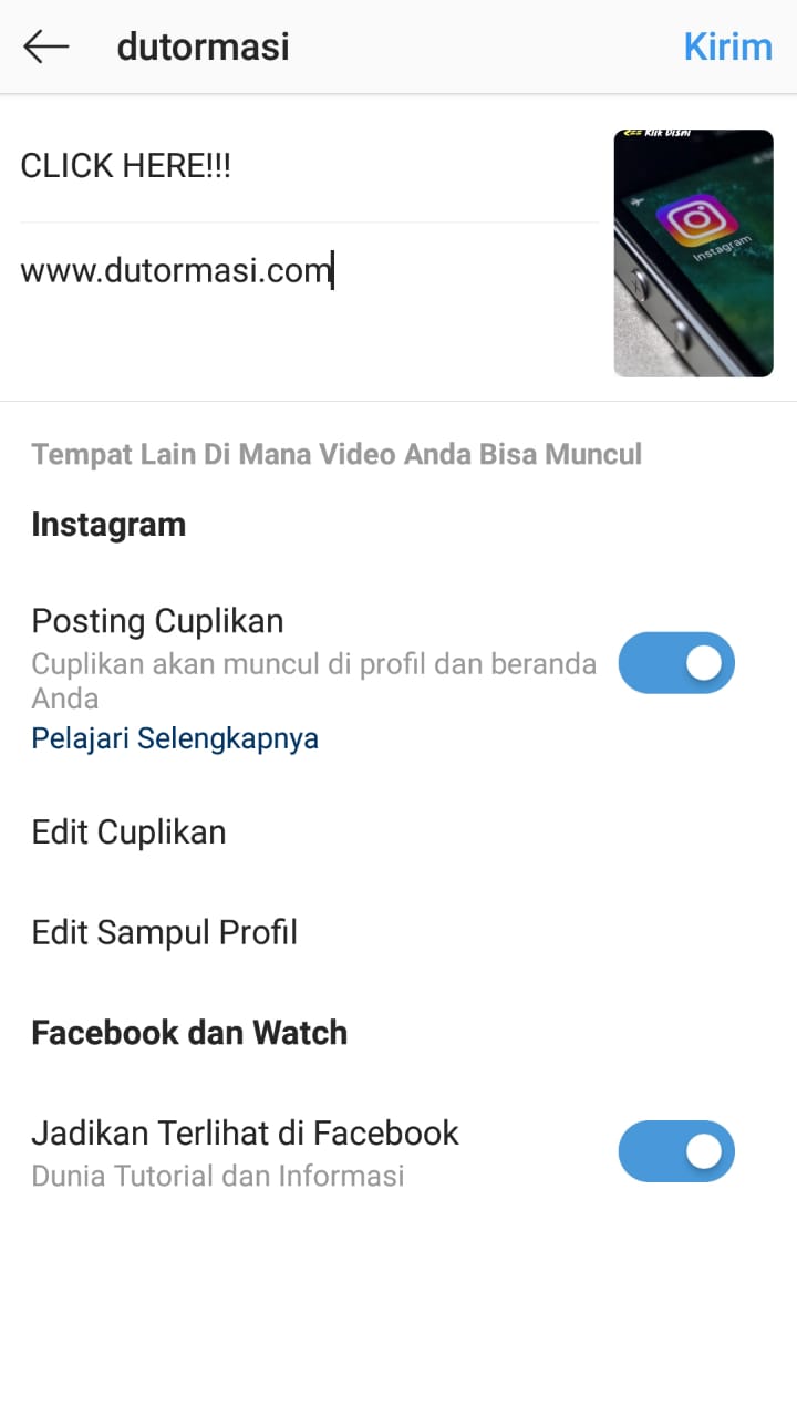9. Buatlah Judul dengan kata kata “CLICK HERE”, dan pada Keterangan Masukkan lah link web atau youtube kamu. Kemudian klik Kirim pada bagian pojok kanan atas. Dan tunggulah proses pengunggahan.