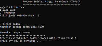2.Hasil running memilih jenis kelamin laki laki dan jika tinggi < 175 ( tidak lolos seleksi).