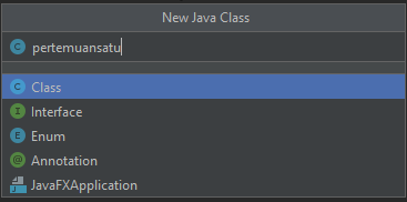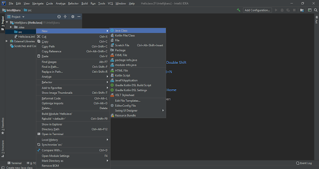 - Klik kanan pada src yang berada di proyek HelloJava, kemudia pilih New —> New Java Class.