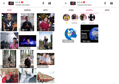 5. Setelah di klik kamu akan melihat daftar feed, cerita, IGTV, maka pilihlah cerita, dan kamu akan melihat daftar stori instagram pengguna baik berupa foto dan video yang diunggah sebelum 24 jam.