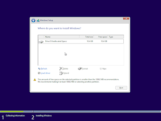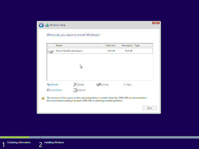 Langkah 14 :Halaman selanjutnya yaitu seperti dibawah ,dihalaman ini pengguna harus memngklik yang ada ditable yaitu Drive 0 Unallocated Space ,jika bacaan next dibawah halaman ini sudah bewarna atau sudah bias diklik maka pengguna dapat mengklik next untuk berpindah ke halaman selanjutnya.