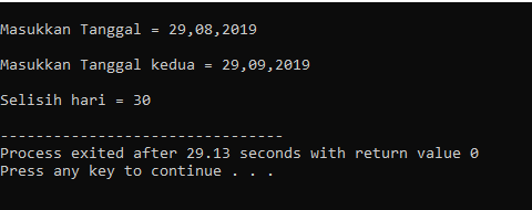 Begitulah program untuk menghitung selisih hari menggunakan Bahasa C. Semoga bermanfaat dan bisa membantu anda dalam menyelesaikan studi kasus membuat program menghitung selisih hari. Jika ada yang belum anda mengerti atau belum anda pahami bisa anda berkomentar pada halaman contact dibawah ini. Sekian dan Terima kasih !