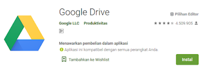 Aplikasi Google Drive ini biasanya digunakan sebagai penyimpanan berbagai macam file, yang biasanya digunakan oleh Mahasiswa untuk mengunduh bahan ajar dari dosen. Dan tak kalah hebatnya aplikasi dapat dijadikan sebagai media penyimpanan berbagai file kamu seperti skripsi, tugas kuliah, foto dan lain lain yang menawarkan ruang penyimpan sebesar 15 GB secara Gratis.