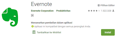 Aplikasi evernote merupakan aplikasi untuk membuat catatan. Kelebihannya dari aplikasi lain, evernote dapat menyisipkan gambar, sehingga membuat kita lebih mudah untuk mengingat yang dityulis dan pentingnya dari catatan itu.