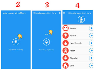 >Anda bisa memilih effect suara yang anda inginkan , banyak pilihan effect suara yang disediakan aplikasi ini diantaranya adalah helium ,anak anak, robot , monster dan ada banyak pilihan lain tentunya.