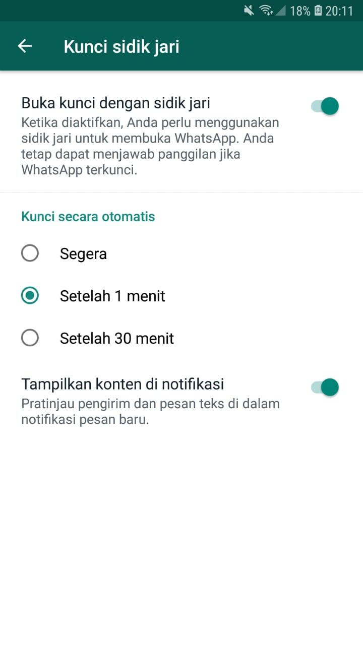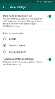 Maka fitur fingerprint lock atau kunci sidik jari anda telah aktif, dan tidak hanya itu, pengguna juga bisa mengatur lebih lanjut, apakah isi chat yang baru akan masuk bersamaan dengan notifikasi ataupun tidak.