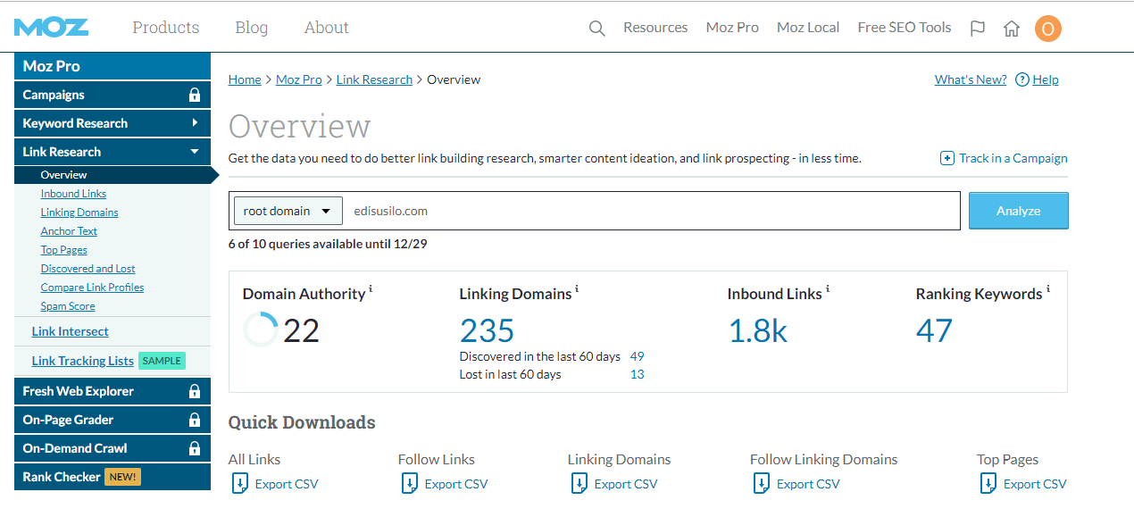 Setelah itu, anda bisa memasukkan URL anda ke dalam kolom yang tersedia lalu klik analyze. Maka hasil DA dan PA anda akan terlihat dan bukan itu saja linking domain dan rank keyword anda juga di perlihatkan pada website ini. Jika anda ingin mengecek URL website lain anda hanya perlu menghapus URL sebelumnya yang ada dikolom lalu isikan URL yang ingin anda cek DA dan PA nya. Kemudian klik lagi analyza maka hasil DA dan PA nya akan terlihat.
