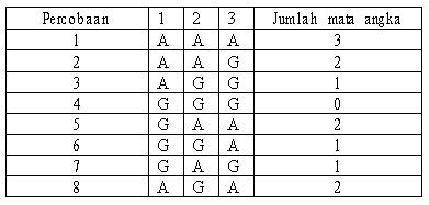 S = {AAA, AAG, AGA, AGG, GGG, GGA, GAG, GAA} Tiap sampel mempunyani peluang sama, yaitu