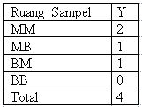 Kemungkinan nilai Y adalah Rp 5000,- bila kejadian E1 = {AAA, GGG} yang muncul dan Rp -3.000,- bila kejadian E2 = {AAG, AGA, AGG, GGA, GAG, GAA} yang muncul.
