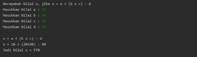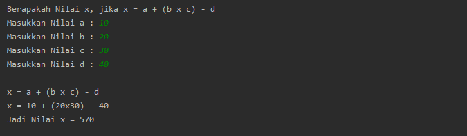Pada program tersebut kita mencari nilai x, dari x = a + (b x c) – d , namun dilihat dari programnya tersebut bahwa variabel mendapatkan input pengguna dari konsol dan kemudian mencetak langsung nilai dari x.