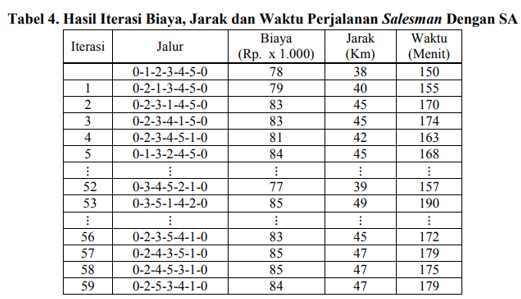 Dengan perhitungan tabel 4 diatas maka dapat dilihat bahwa hasil iterasi SA menunjukanan minimum biaya perjalanan pada rute yaitu rute 0 – 3 – 4 – 5 – 2 – 1 – 0 dengan biaya perjalanan Rp. 77.000 jarak tempuh 39km dan waktu perjalanan 157 menit atau 2 jam 37 menit.